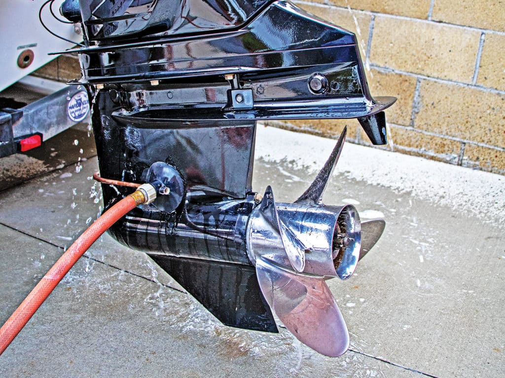 Outboards and most sterndrive engines feature cooling-water intakes on the gear case—the lower unit—typically located on the side of the case, and sometimes on the gear-case torpedo (to allow for higher mounting and trim angles without losing cooling water). For these, a motor flusher typically is used. I recommend the more costly type that allows water to flow into both sides of the muffs.