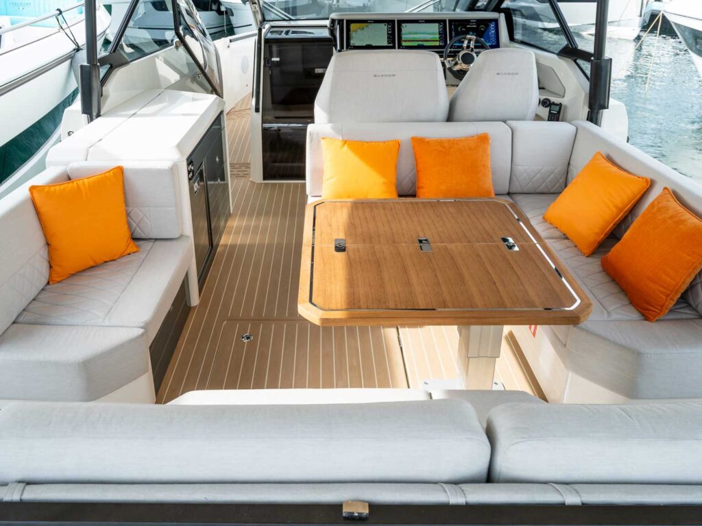 The 400 GTO’s signature feature is its 13-foot-long pair of sidewalls, which Saxdor calls terraces, and that drop outboard to increase deck space when the engines are off. These transform the 400 GTO into a floating oasis with a party vibe that will draw envious looks at the sandbar. The stern area feels even larger thanks to the clear transom with port and starboard clear entry doors that expand the view. There’s a pair of swim platforms, and there’s enough real estate aft to walk fully across its 11-foot-8-inch beam.