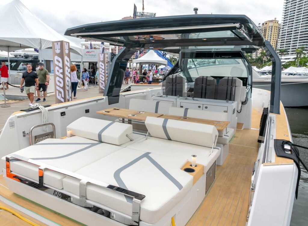 This is a beamy boat at 12 feet, 8 inches, and Fjord makes the most of every inch. Six different layouts are offered: Our test boat offered a massive sun pad aft with walkways to the transom on each side and an extending shade from the hardtop. The backrests flip to create two-sided seating around a clever dining/snack/cocktail table with five folds to precisely fit many needs.