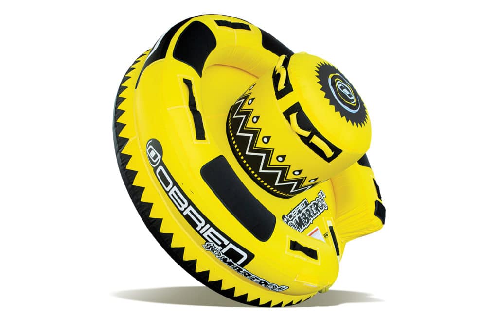 The minute they noted the word “spinner” in this tube’s name, riders knew they were in for an interesting experience. That’s because in addition to the normal slipping and sliding across the wakes that define any favorite inflatable, the Cyclone Spinner can actually spin. Yup, round and round—like a record, baby. A tow point on the bottom and at the center of the inflatable’s 88-inch diameter makes this possible. It rotates on stainless-steel ball bearings, clockwise or counterclockwise, depending on the Cyclone’s motion.