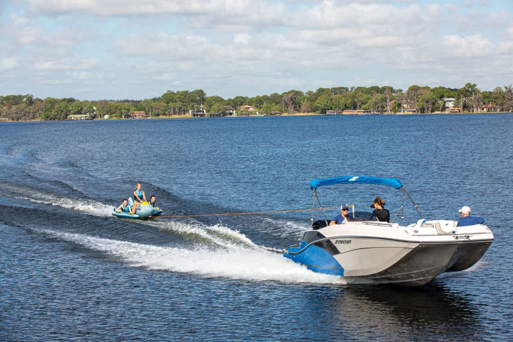 Watersports invite participation, not only by riders at the end of the towrope, but also family and friends taking it all in from the cockpit. Starcraft’s SVX 231 excels in this regard. Ample seating rings most of the perimeter, from parallel couches forward to the L-shaped bench that wraps the port side and beam. The cockpit’s depth provides a secure feel, especially with kids aboard. A swiveling passenger seat is perfect for a rear-facing spotter. As the captain, just be conscious of bow rise; the gentler acceleration required for an inflatable can cause a few seconds of limited visibility forward.
