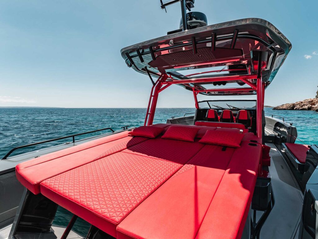 The Shadow 1200 Sun-Top features a walk-around cabin layout that makes anchoring and docking easy, and provides a separate social and lounging area in the bow. Enter this cabin from either the helm or the winglike forward doors port and starboard. That’s functional and unique. Open the companionway and the wing doors together to create great flow between exterior and interior. Essentially, you gain a separate lounge area when the cabin is not being used as a berth. There’s an enclosed head in here, as well as the convertible V-berth, tables and a separate sofa. The 1200 Sun-Top we tested debuted with special Brabus Red leather upholstery that’s beautifully stitched and tufted. This striking upholstery, together with matching Sun-Top pipework and a hull that gleams in Phantom Grey paint, makes an impressive visual statement. The so-called 1-second wow factor that Brabus strives for has been achieved.
