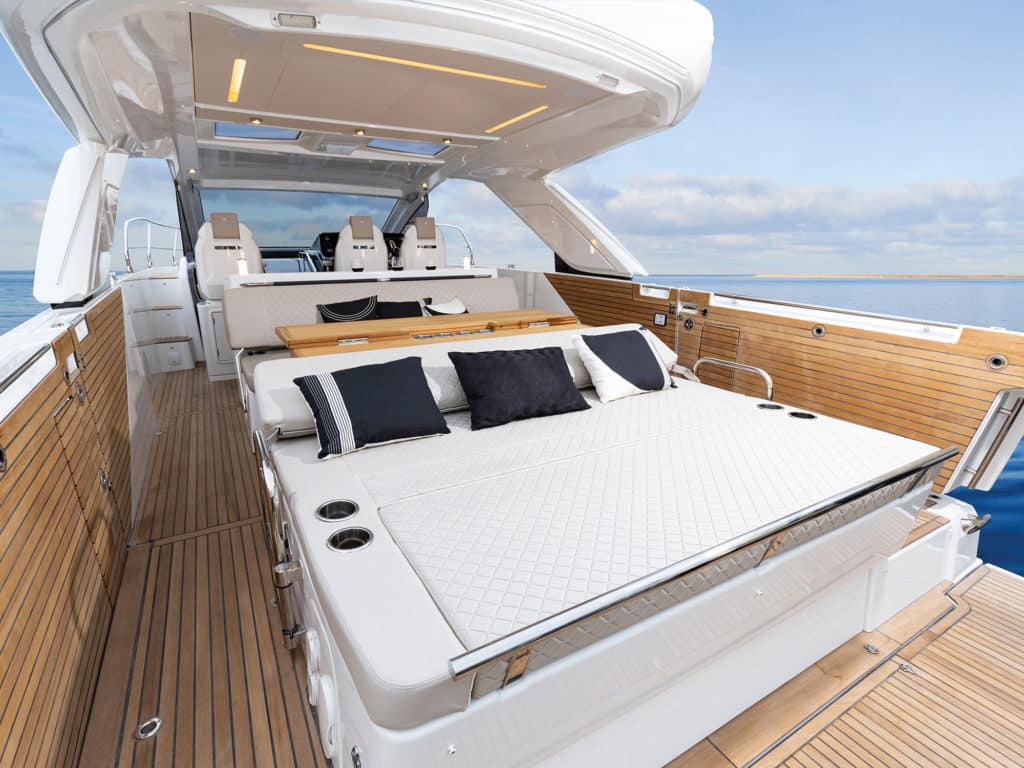 Overall, the cockpit layout packs in all the essentials without feeling cramped, whether those platforms are up or down. There’s a sun pad aft, beneath which is a locker big enough for fenders and the life raft, plus perhaps a Seabob docking station. Then there’s a large double-leaf dining table that will easily seat six. Both benches that address the table have storage beneath and two-way backrests, and then there’s a great wet-bar/galley module amidships. There are three pilot seats beneath the windshield, all with bolstered cushions and armrests. The driver’s seat and bridge console are offset to starboard. Overhead, a hardtop provides weather protection for about three-quarters of the cockpit. This includes two small skylights that help take away some of the shadows. When you want proper UV rays, hit the switch—there’s also a large electric-opening sunroof. Optional ($9,000) 12,000 Btu air conditioning cools the cockpit and helm, while 20,000 Btu serves the cabin.