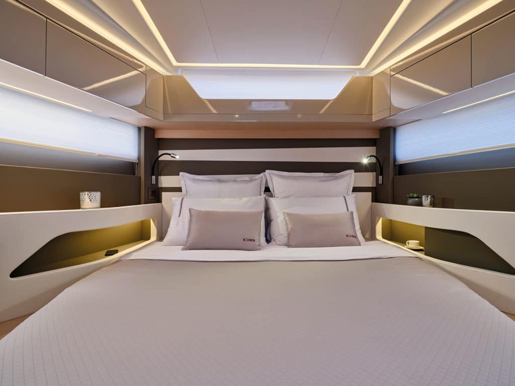 Although ostensibly competing with the likes of European brands Fjord and Pardo, the DB/43 has dispensed with easy-to-walk-around decks. You have to climb three steps on each side to get up onto the foredeck. But what you get in return is plenty of headroom in the master stateroom forward. Ringed by a low guardrail, the foredeck is still packed with utility. There’s not only another sun pad here, but also a forward-facing mini seat with a footwell and the option of a small table.