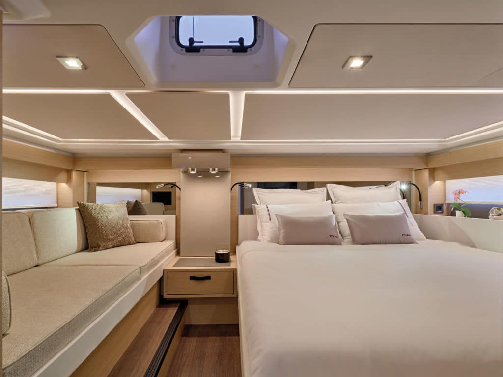 Light-oak veneers are standard in the cabin. In standard guise, there’s a secondary galley module to port of the companionway. But an alternative to this is a second head and shower-room compartment. The standard layout includes two staterooms and just the one shower room that has Jack-and-Jill doors, one to the master stateroom in the bow and the other to the lower salon area. If the second shower stall is installed aboard, the other loses a door and becomes a regular en suite to the principal cabin. The master stateroom location is given away from the outside by those long hull windows running virtually to the stem.