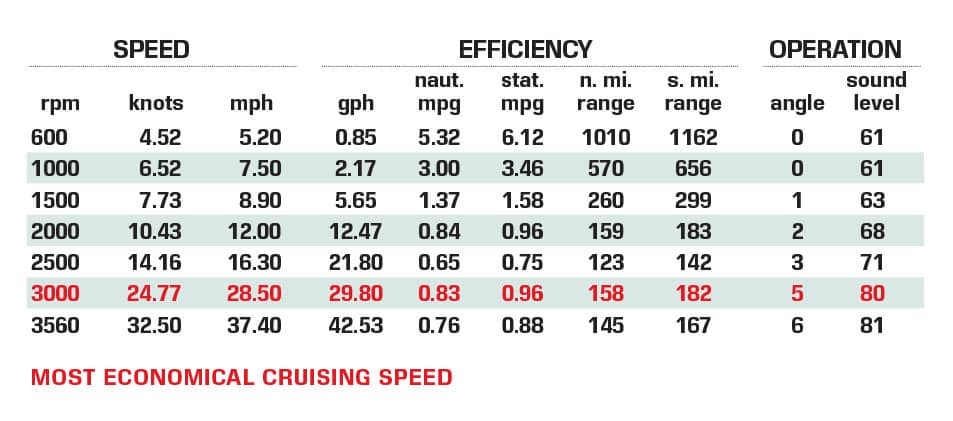 Shoppers should check out the MJM 42 (starting at $1,616,910 powered like our test boat). It’s another fine-running boat with unique lines and offered with a choice of either twin Mercury 600 hp V-12 outboards or twin Volvo Penta diesel Aquamatic drives. It comes with a larger fuel tank and is built with epoxy-infused construction. Also consider the Cruisers Yachts Cantius 42, powered by twin Volvo Penta IPS 500 pods (starting at $1,290,485).