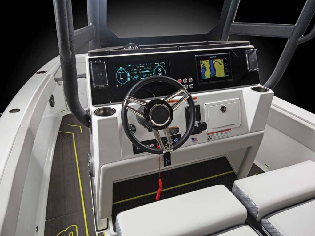 The Wake Edition Package ($9,600) adds a 12.3-inch Medallion Viper III touchscreen at the helm, board racks, and plumbing to fill a Fatsac ballast bag intended for placing on the lowered tailgate. The screen is used to set up speed and acceleration profiles, control the ballast pump, and manage the audio and RBG lighting systems, in addition to displaying engine and boat-function information. The standard display is a 7.2-inch Medallion/BRP touchscreen. Because the boat is jet-powered, it’s safely surfable. Order the Fishing Package ($2,735) to add a baitwell below the helm seat, rocket launchers on the T-top, inwale rod stowage, and lure boxes below the forward deck.